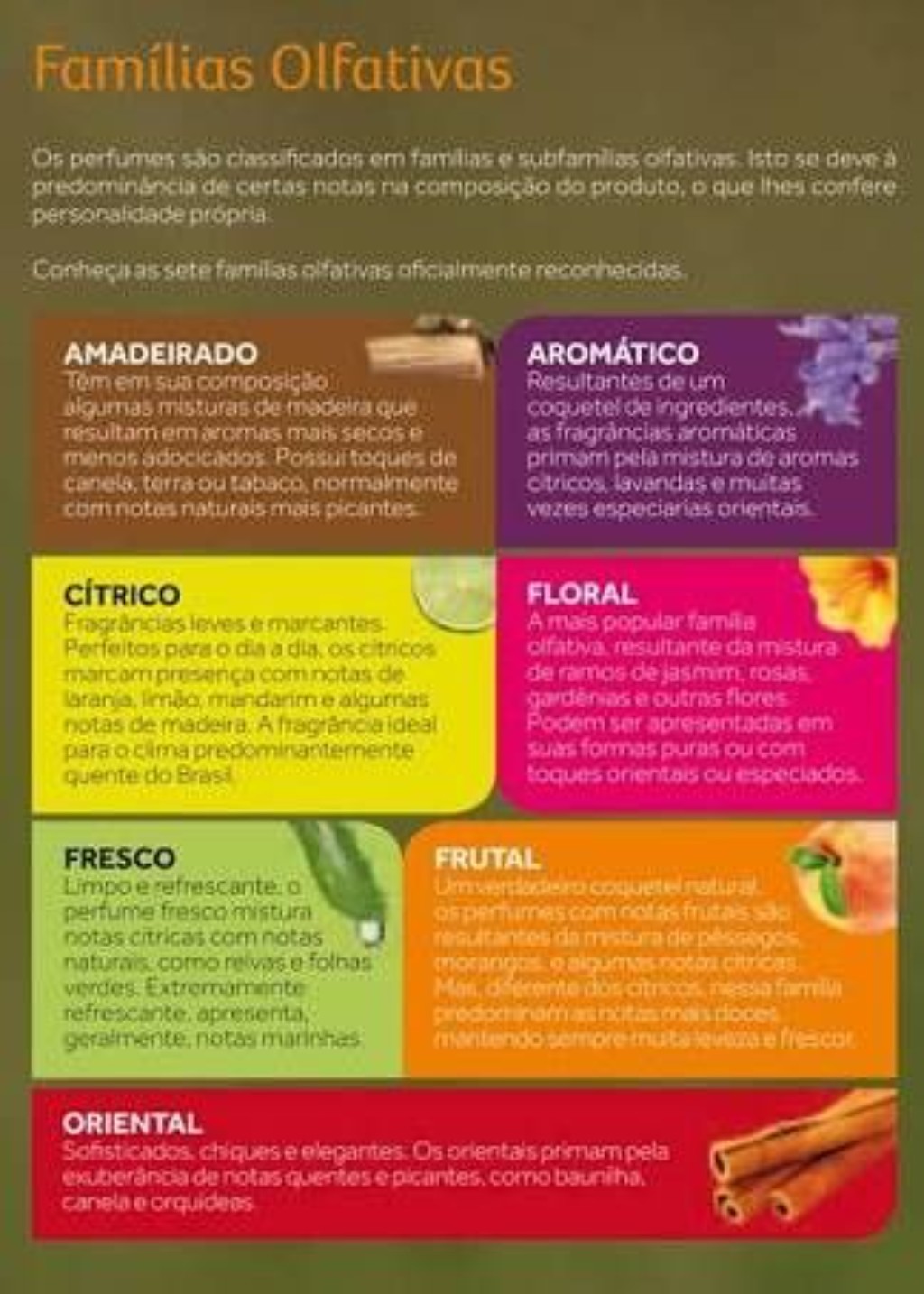 As principais são: floral, cítrica, amadeirada, oriental/âmbar, gourmand, aromática, chypre e frutada.